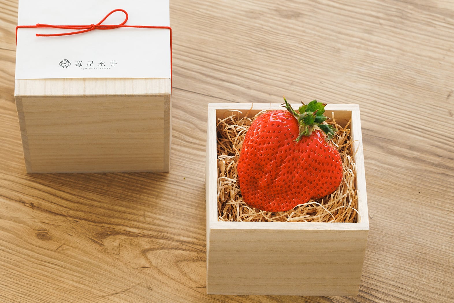 大粒のイチゴ「あまい雫」の中でも1シーズン畑ひと畝に1つか2つしか採れない70g以上、平均糖度17〜18度、最高糖度22.3度のイチゴが[極み]になります。箱を開けると、まずその大きさに目を奪われますが、一口では食べきれない薄紅色の大きな果実を頬張れば、桃のような華やかな香りが広がり、ジューシーな果汁が口いっぱいに溢れます。自然と職人の技が融合して生まれた、究極のひと粒をぜひご堪能ください。桐箱に大切に梱包してお届けします。